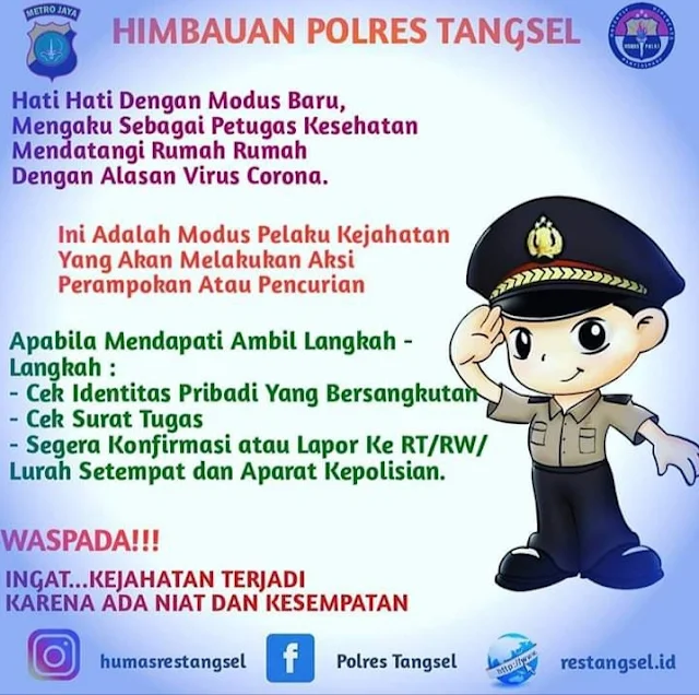Jakarta (MI)- Wabah virus Corona tengah menjadi perhatian Indonesia dan dunia internasional. Di tengah wabah virus Corona ini, Polri mengimbau masyarakat untuk mewaspadai modus-modus perampokan yang memanfaatkan isu terkait Corona. Imbauan Polri ini disosialisasi di sejumlah media sosial resmi kepolisian. Salah satunya di-posting di akun Instagram Humas Polres Tangerang Selatan @humaspolrestangsel.